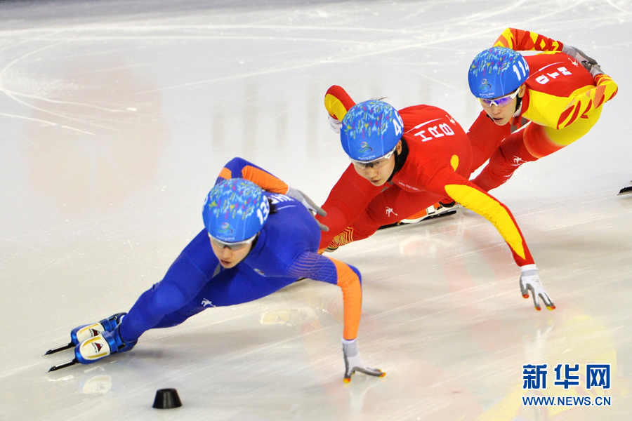 1月19日,七台河队选手范可新(右)在第十三届全国冬季运动会短道速滑女子1000米预赛中。新华社记者陈斌 摄