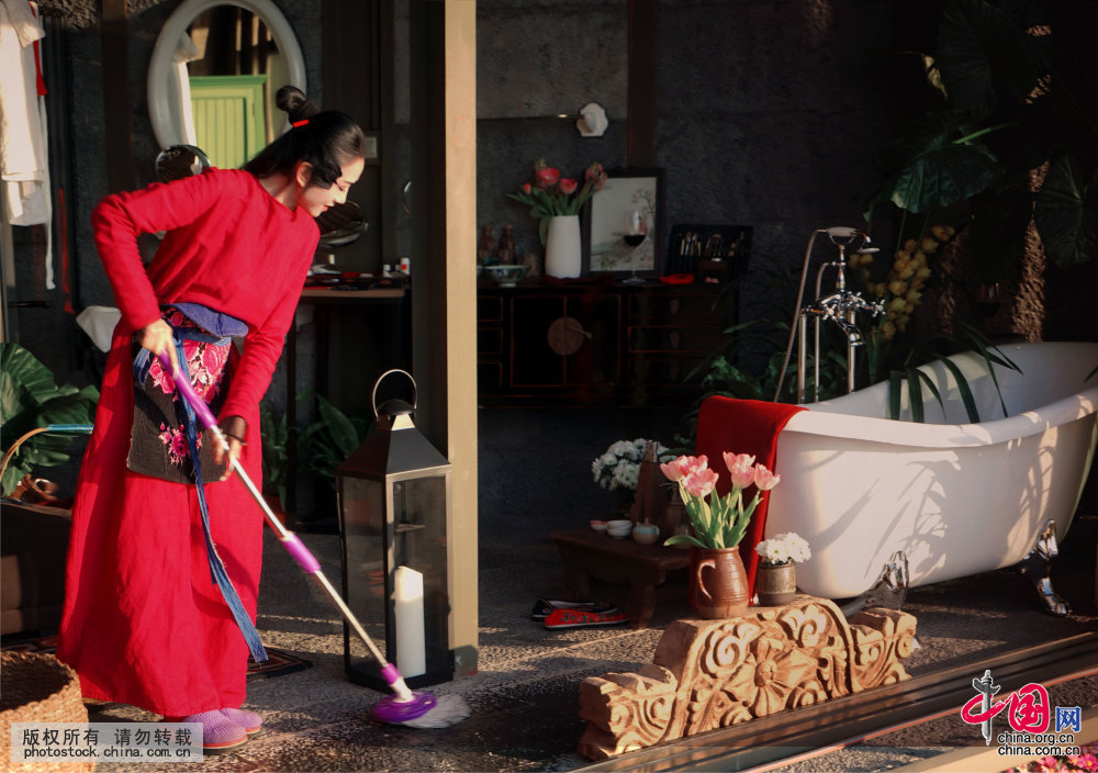 2月18日,云南大理,杨丽萍走下舞台回到大理洱源陪妈妈过年。在家中,杨丽萍变身家庭主妇,打扫、做饭、布置家装等事情,全部都是亲力亲为,并且样样都很拿手。中国网图片库 贾海峰 摄