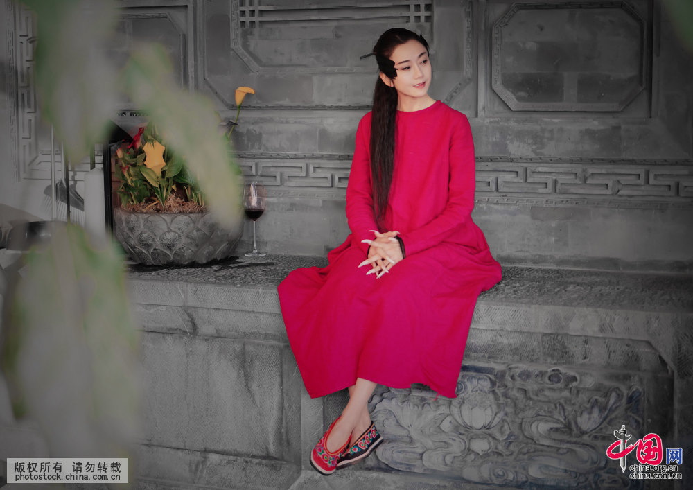 杨丽萍坐在自家的院落中,一身红裙仙气十足。