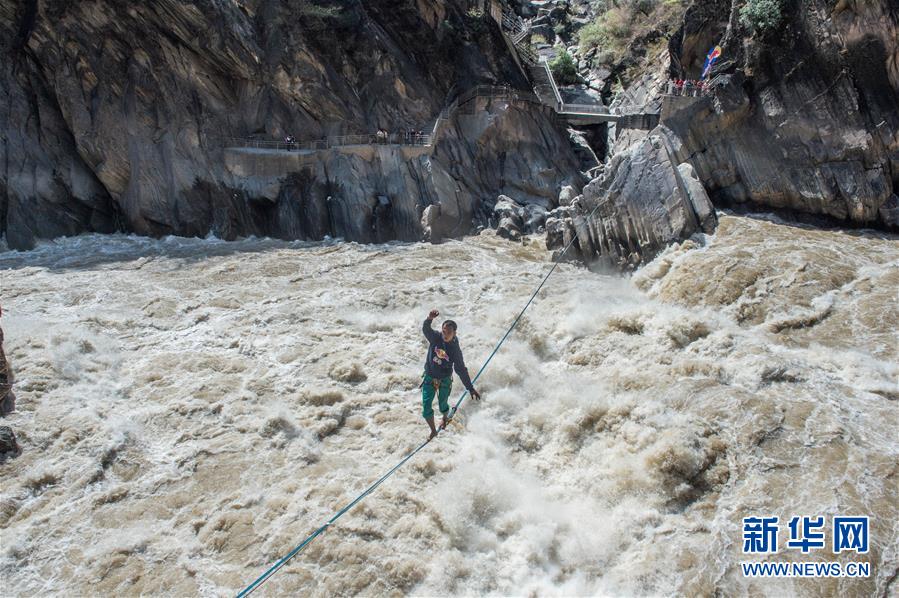 4月26日,张亮在扁带上行走。当日,在云南香格里拉的长江天险虎跳峡上,“中国扁带第一人”张亮利用宽度只有2.5厘米的扁带,在距离江面16米的高度上成功行走60米,耗时5分58秒抵达虎跳峡香格里拉一侧的终点完成挑战。  新华社记者胡超摄