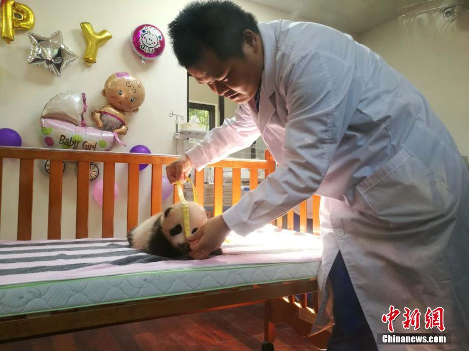 9月9日,在“中国大熊猫保护研究中心上海基地”诞生的首只大熊猫宝宝“双满月”,有了自己的名字“花生”。当日,工作人员给“花生”体检,两月前降生的“花生”体重由151克增至3285克,体长自14.3厘米增至52厘米,其各项身体指标良好,正在茁壮成长。中新社记者陈静 摄