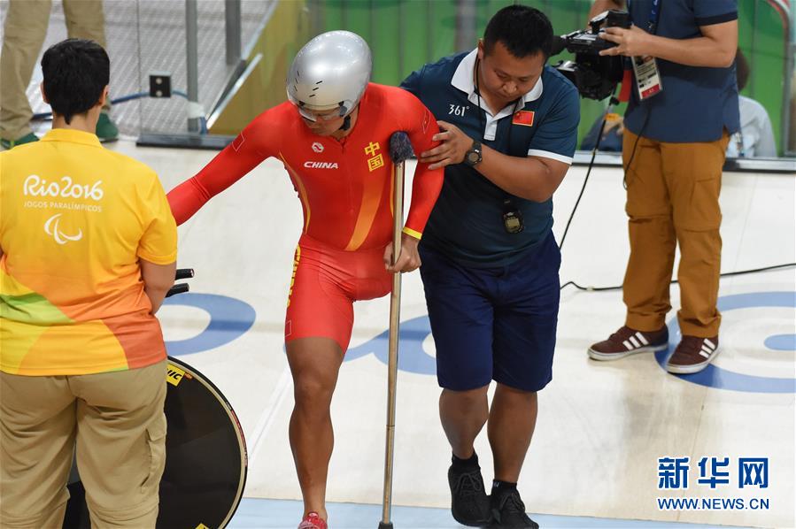 9月9日,中国残奥自行车队教练刘光锦(右)在赛前帮助选手梁贵华上车。