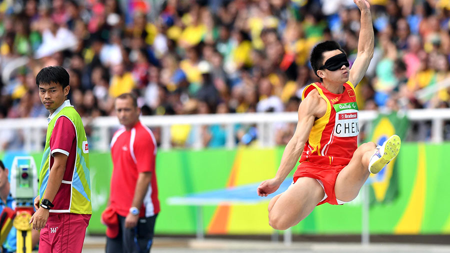 9月8日,陈星宇(右一)在比赛中。当日,在2016年里约残奥会田径男子跳远T11级决赛中,中国选手陈星宇以5米74的成绩获得第七名。新华社记者李钢摄