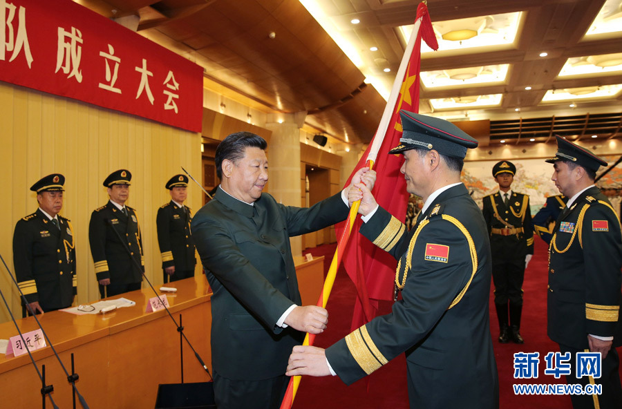 9月13日,中央军委联勤保障部队成立大会在北京八一大楼隆重举行。中共中央总书记、国家主席、中央军委主席习近平向武汉联勤保障基地和无锡、桂林、西宁、沈阳、郑州联勤保障中心授予军旗并致训词。这是习近平向桂林联勤保障中心主任、政治委员授军旗。新华社记者李刚摄