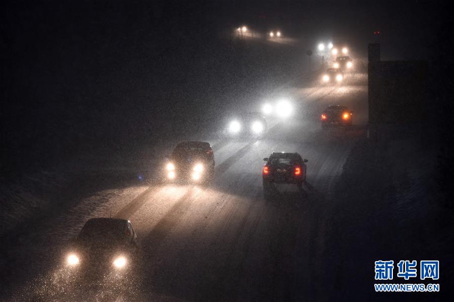 1月13日,汽车在德国中部的一条公路上冒雪行驶。