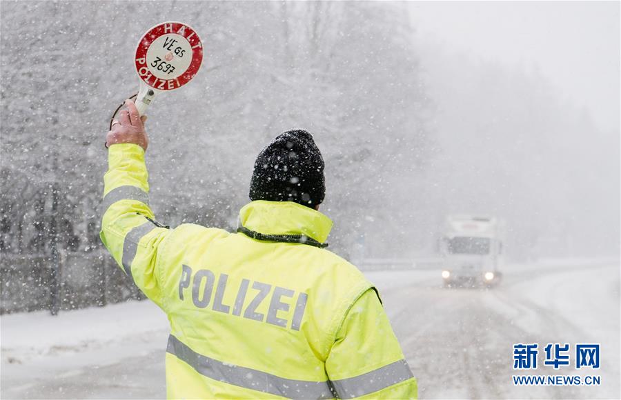 1月13日,一名警察在德国中部巴特哈尔茨堡附近的一条公路上冒雪指挥车辆。