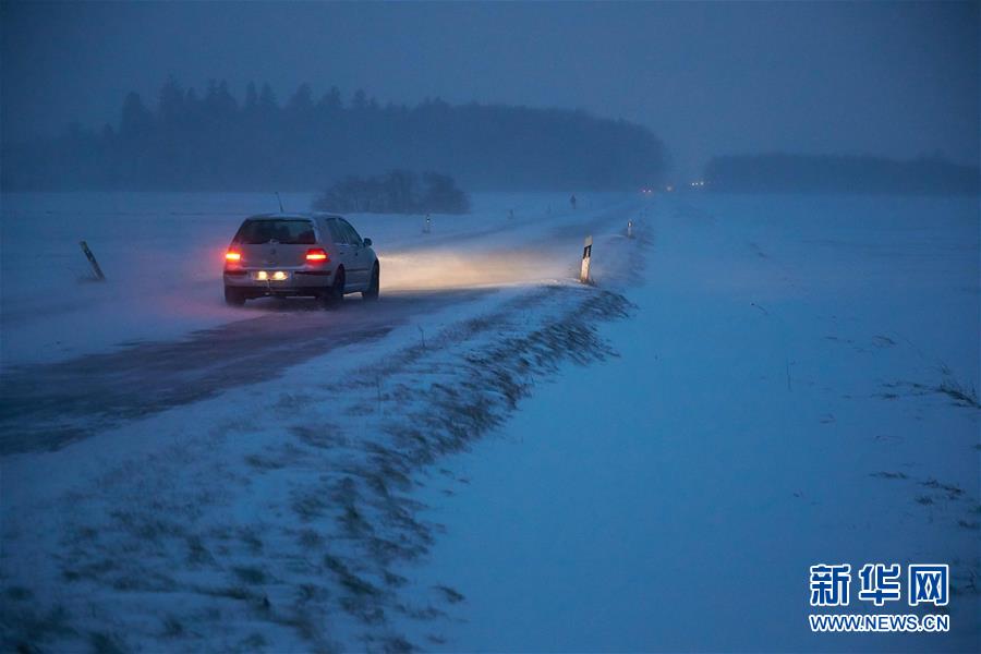 1月13日,在德国西部的莱茵兰-巴拉丁州锡门附近,一辆汽车冒雪行驶。
