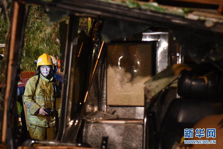 2月14日,救援人员从事故车辆旁经过。据台湾消防部门2月14日消息,13日晚发生的台湾游览车翻车事故已造成33人死亡、11人受伤。 13日21时6分许,在台湾公路主干道5号南港系统交流道接3号南下路段,台北市蝶恋花旅行社一辆游览车翻覆于引道边坡,车内共44人(游客42人,导游、司机各1人),没有大陆游客。新华社记者欧东衢 摄