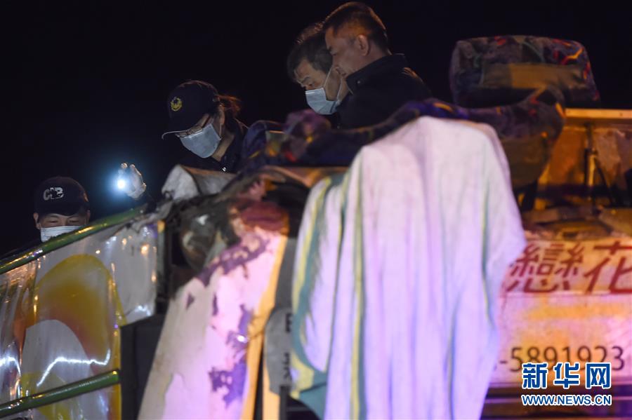 2月14日,工作人员在事故车辆上取证。据台湾消防部门2月14日消息,13日晚发生的台湾游览车翻车事故已造成33人死亡、11人受伤。 13日21时6分许,在台湾公路主干道5号南港系统交流道接3号南下路段,台北市蝶恋花旅行社一辆游览车翻覆于引道边坡,车内共44人(游客42人,导游、司机各1人),没有大陆游客。新华社记者欧东衢 摄