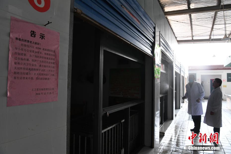 2月16日,安徽合肥王卫社区卫生防疫工作人员对活禽市场进行喷洒消毒药水消毒。安徽省卫计委14日发布信息称,安徽省目前H7N9流感发病仍呈上升趋势,已致20人死亡。安徽多地关闭活禽交易市场。中新社记者 韩苏原 摄