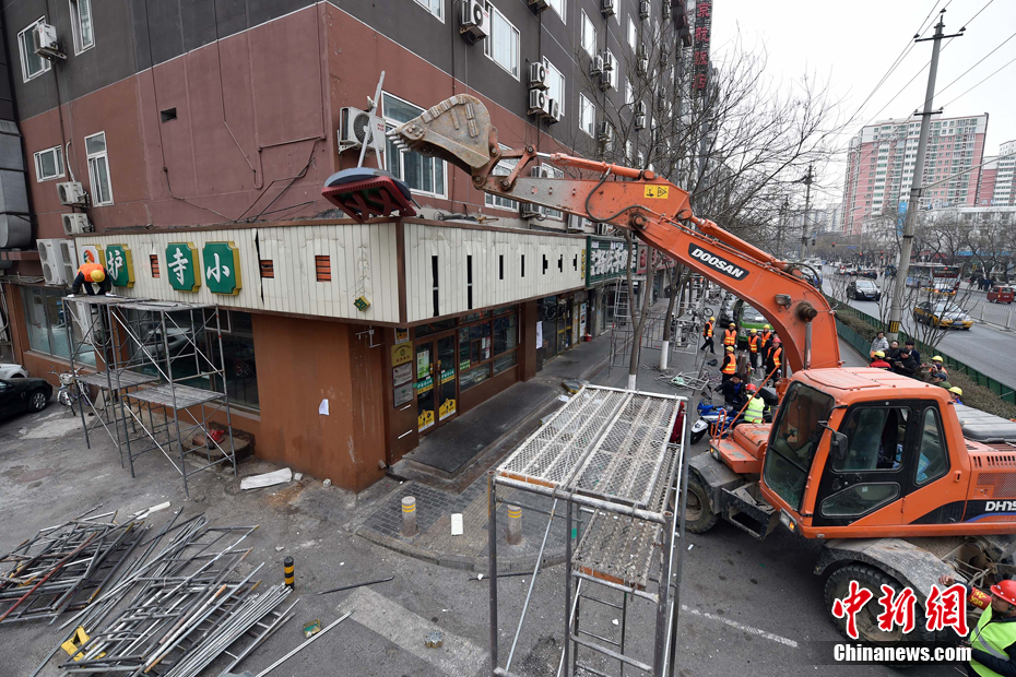 2月21日,北京市西城区白纸坊西街上,聚集了不少工程车和执法人员,随着对大清花饭店门前避风格的拆除,拉开了白纸坊地区2017年“开墙打洞”整治行动的序幕。据悉,由于历史原因,白纸坊西街南侧不少居民楼底墒形成了大量违法建设,白纸坊街道环境整治办统计,在500米左右长的街道上聚集了几十家存在“开墙打洞”行为的商户。预计到2017年9月前,白纸坊地区将集中整治周边10条大街的300多处“开墙打洞”等违法行为。中新网记者 金硕 摄