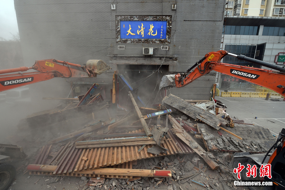 2月21日,北京市西城区白纸坊西街上,聚集了不少工程车和执法人员,随着对大清花饭店门前避风格的拆除,拉开了白纸坊地区2017年“开墙打洞”整治行动的序幕。据悉,由于历史原因,白纸坊西街南侧不少居民楼底墒形成了大量违法建设,白纸坊街道环境整治办统计,在500米左右长的街道上聚集了几十家存在“开墙打洞”行为的商户。预计到2017年9月前,白纸坊地区将集中整治周边10条大街的300多处“开墙打洞”等违法行为。中新网记者 金硕 摄
