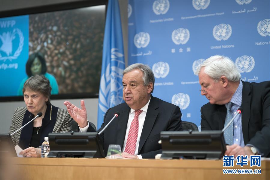 2月22日,在位于纽约的联合国总部,联合国秘书长古特雷斯(中)、联合国开发计划署署长海伦·克拉克(左)与联合国负责人道主义事务和紧急援助协调的副秘书长斯蒂芬·奥布莱恩出席新闻发布会。联合国秘书长古特雷斯当日说,南苏丹、索马里、也门和尼日利亚四国有2000多万人面临饥荒,急需44亿美元援助。新华社记者李木子摄