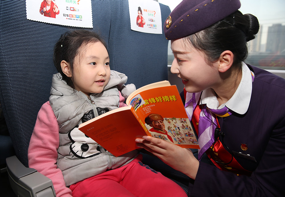 3月3日,列车员袁嘉玲在其值乘的G360次列车上给小旅客讲解雷锋读物。