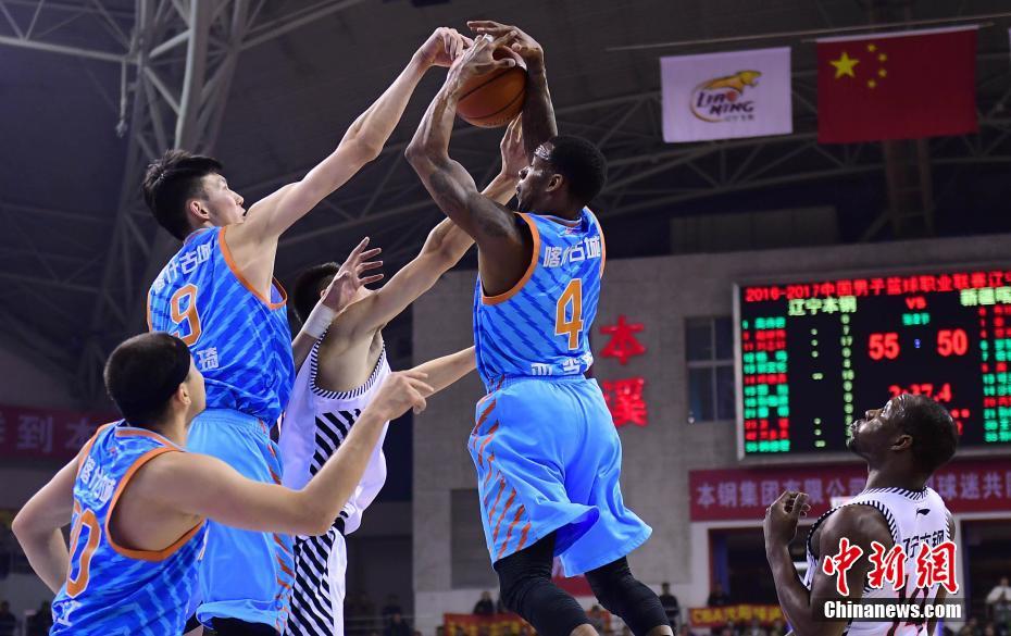 3月17日晚,辽宁本溪,2016-2017赛季中国男子篮球职业联赛(CBA)半决赛第四场比赛,辽宁本钢队(白)主场最后4秒上演争议绝杀,以109比107战胜新疆喀什古城队,总比分1比3落后。中新社记者 于海洋 摄