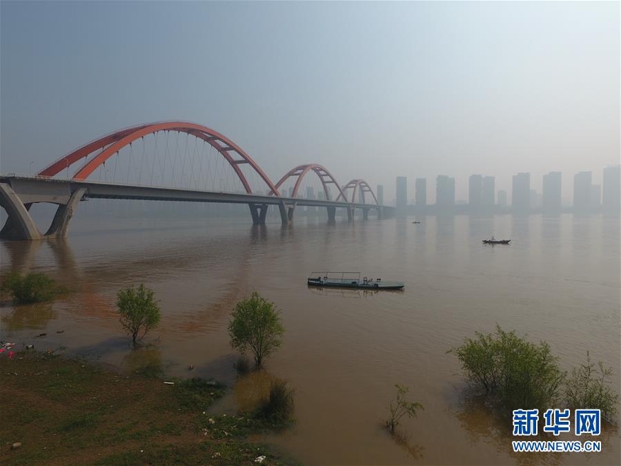 4月1日,长沙福元路大桥附近湘江沿岸昔日裸露的河滩被上涨的江水淹没。