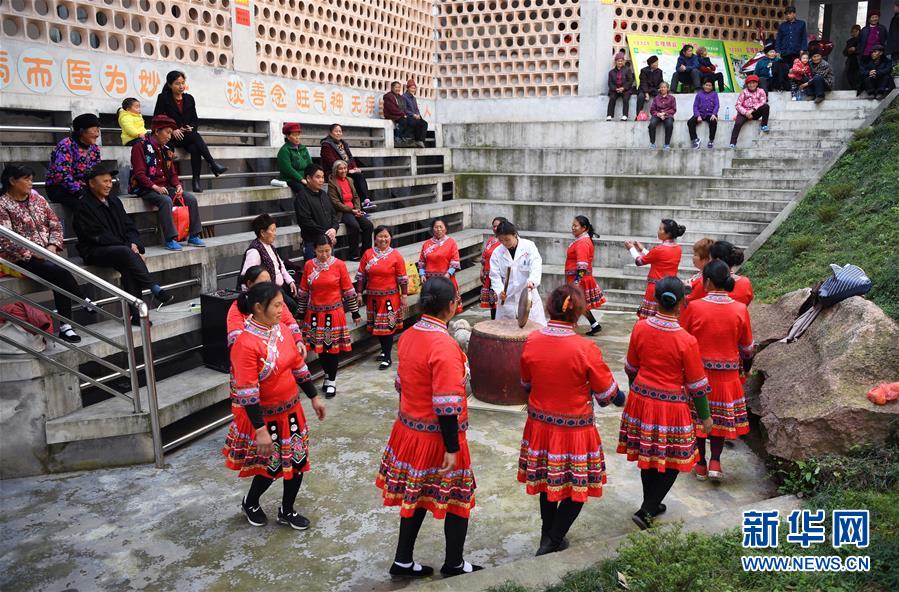 昂洞卫生院院长田蕊和当地村民在卫生院的天井公共活动区域参加民族舞蹈活动(3月31日摄)。新华社记者李尕 摄