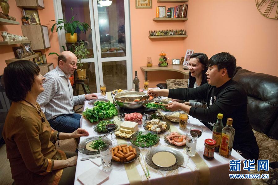 2017年4月13日,在白俄罗斯明斯克,刘贵宾(右一)与妻子纳斯佳(右二)及岳父岳母一起吃火锅。