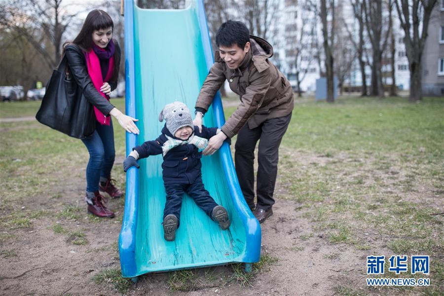 2017年4月18日,在白俄罗斯明斯克,刘哲源一家在户外玩耍。
