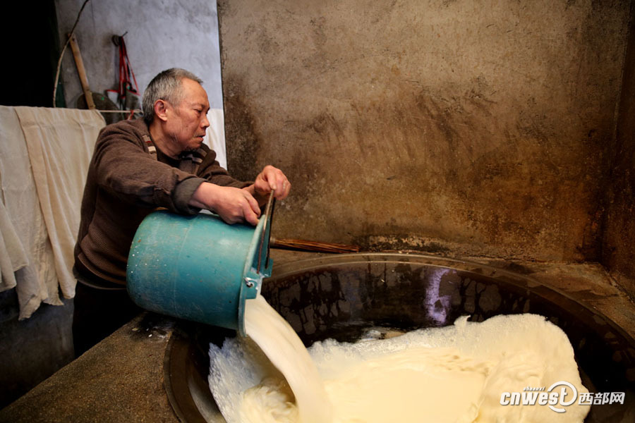 李祖铁在家做豆腐,老伴到菜市场卖,做的豆腐少,挣的钱勉强能维持生活。再加上妻子几次住院花了不少钱,这个家陷入了贫困,当地政府也在帮扶他们,但李祖铁说困难得靠自己解决,每天做一点豆腐总比躺着等救济强。图为将刚磨好的豆浆倒入大铁锅。