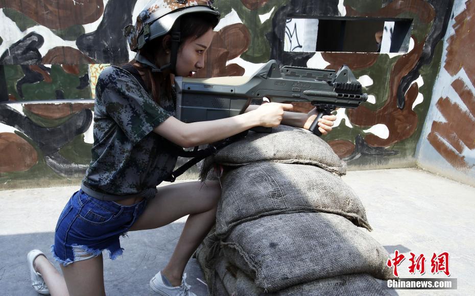 5月28日,正在重庆参加2017国际旅游小姐大赛中国总决赛的选手,来到当地真人cs-拓展训练基地体验军训。图为首次体验拓展训练运动的佳丽兴致勃勃各得其乐。中新社记者 钱兴强 摄