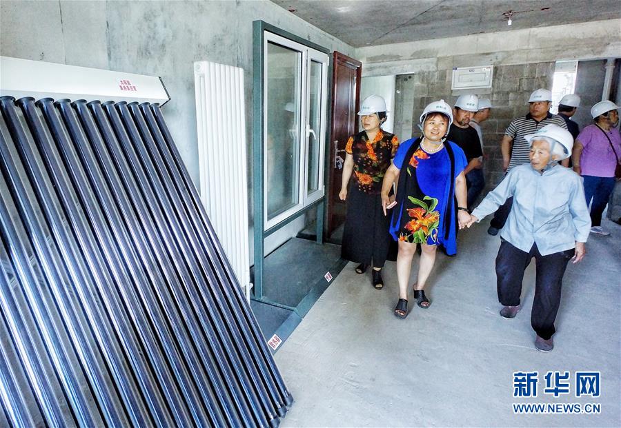 6月27日,刘奶奶(前右)在社区干部陪同下,到回迁楼工地观看新楼房配置的太阳能热水器。当日,大兴区榆垡镇82岁的刘淑芬奶奶在社区干部陪同下,来到北京新机场拆迁安置房小区,观看她明年就能入住的拆迁安置房小区以及给居民们配置的装修材料。