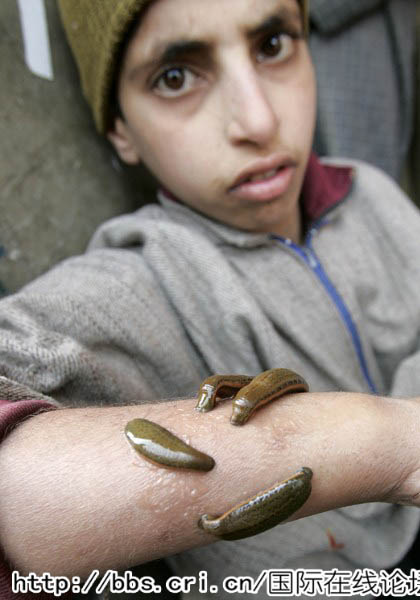 克什米尔地区,一名男孩在接受水蛭疗法。