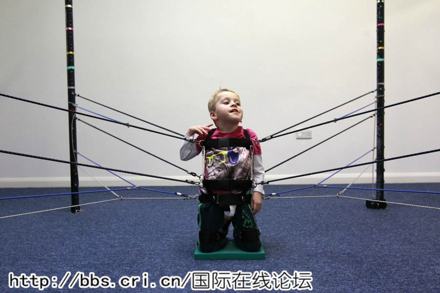 英国南部,一名儿童在一个名为“蜘蛛网”的理疗器上进行理疗。