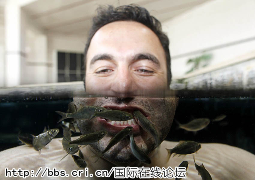 土耳其锡瓦斯附近的坎高,一名患有“牛皮癣”的男子在接受“鱼大夫”的治疗。