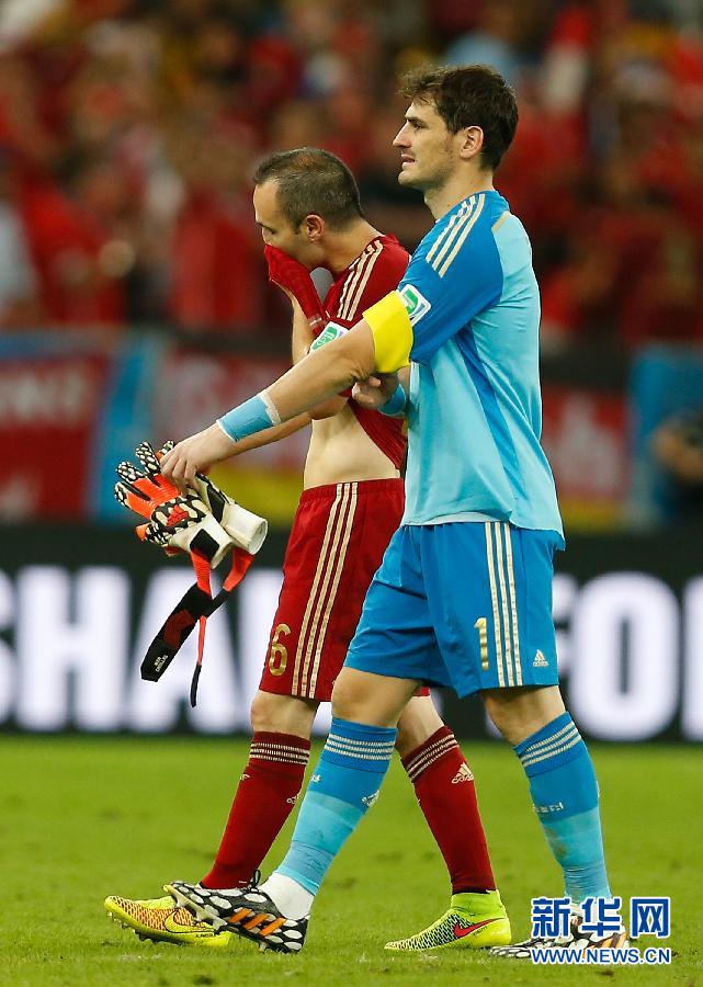 6月18日,西班牙队守门员伊·卡西利亚斯(右)在比赛后退场。当日,在巴西里约热内卢马拉卡纳大球场进行的2014年巴西世界杯小组赛B组比赛中,卫冕冠军西班牙队以0比2负于智利队,以两战皆负的战绩,提前出局。新华社记者王丽莉摄