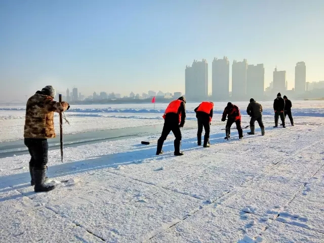 2016-12-15,哈尔滨松花江。正在进行户外采冰作业的农民工兄弟,每天冒着零下二十几度的严寒披星戴月。作者:吴胡荼
