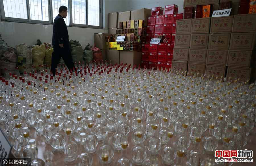 现场查获的大量假酒和制假设备。凯撒/视觉中国