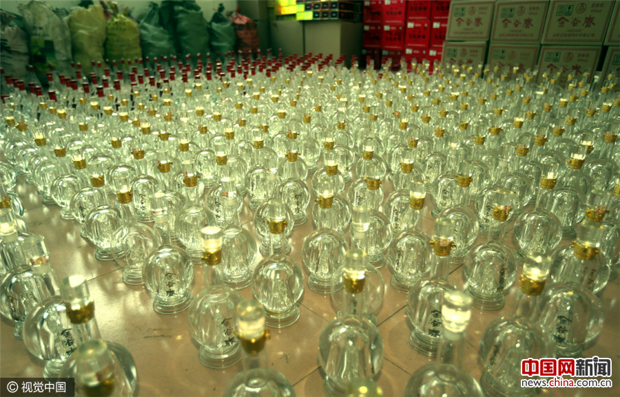 现场查获的大量假酒和制假设备。凯撒/视觉中国