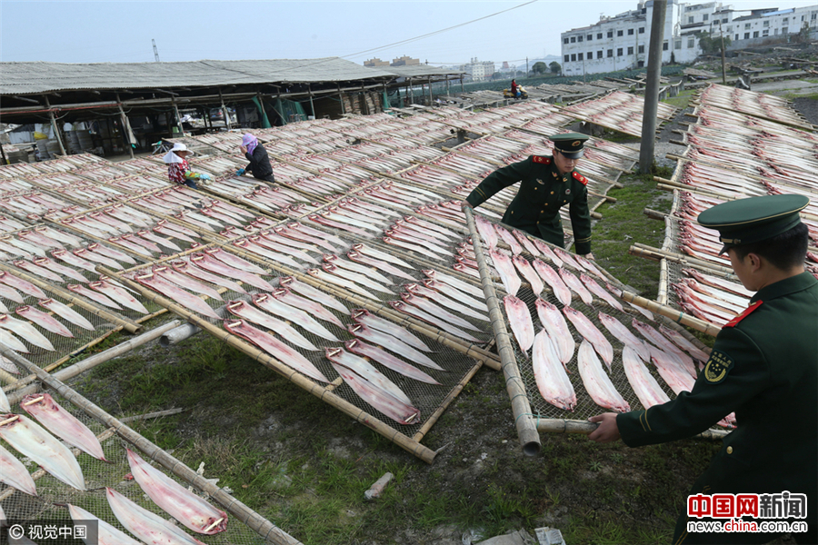 2017年1月9日,浙江省温州市蒲岐镇下侯宅村,村民忙着晾晒各种鱼干、鱼鲞供应春节市场。李兵/视觉中国