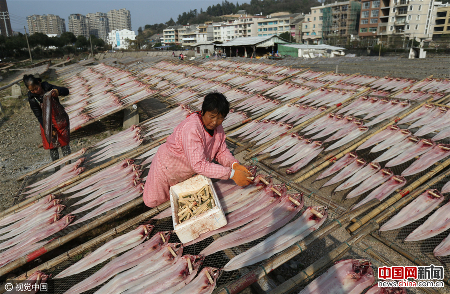 2017年1月9日,浙江省温州市蒲岐镇下侯宅村,村民忙着晾晒各种鱼干、鱼鲞供应春节市场。李兵/视觉中国