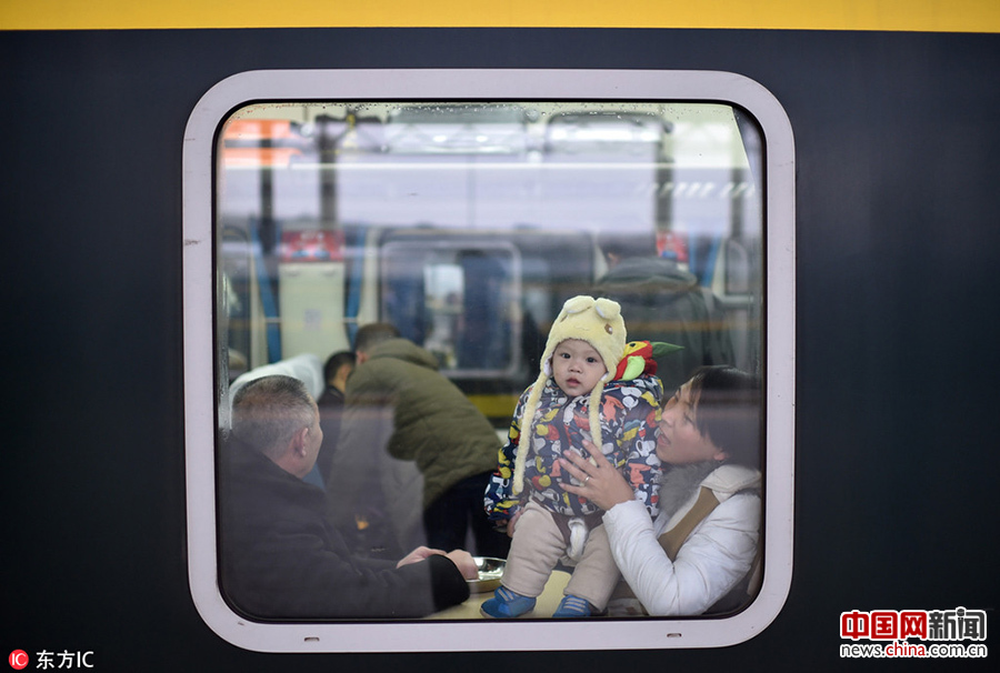 2017年1月15日,石家庄通往通辽的列车上,向车窗外张望的孩子。 2017年春运拉开帷幕,在春运大潮中,有很多孩子跟随父母一起迁移,或是离开父母忙碌的城市返乡过年;或是与父母和亲人一起踏上春节游玩的路途。这些春运“小天使”稚嫩可爱的面孔给春运增添了一道道温馨的风景。