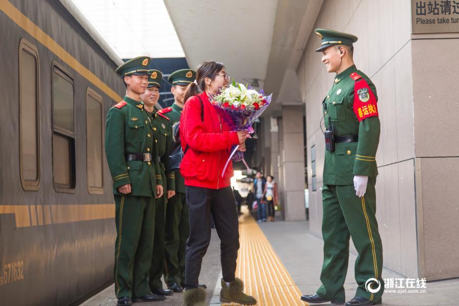 未婚妻黄梦姣乘坐火车来到站台,给了正在执勤的张清华大大的惊喜。浙江在线记者 倪雁强 摄 图片来源:浙江在线