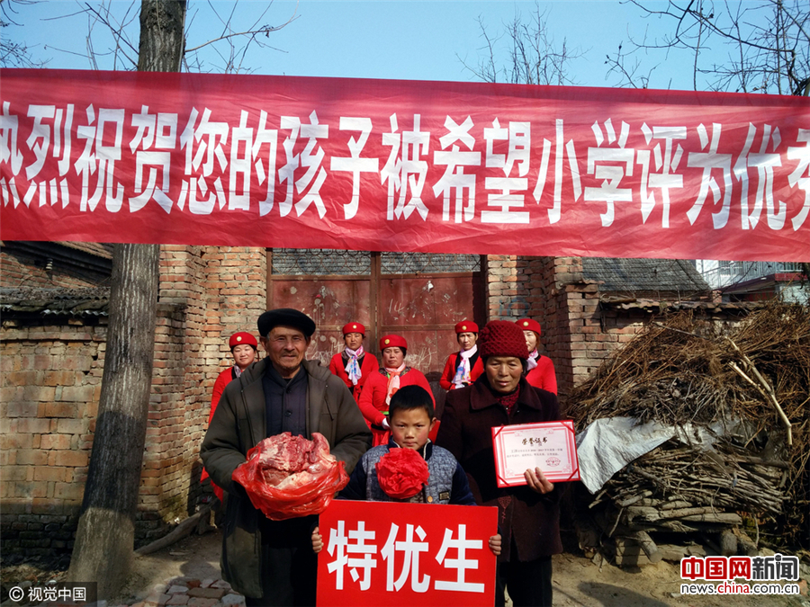 2017年01月22日,河南省周口市,为奖励在本次抽评考试中获得“双百分”和单科成绩100分的孩子,河南省周口市郸城县秋渠乡希望小学购买了数十个猪后臀,敲锣打鼓送到这些孩子家中。王俊/视觉中国