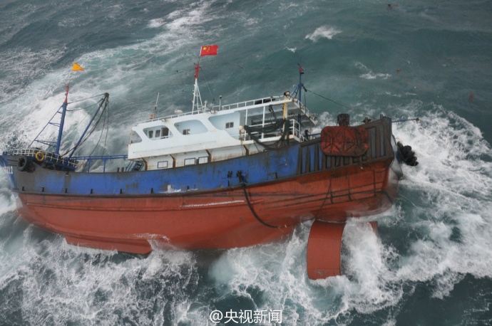 图为即将沉没的中国籍渔船,现场浪高4—5米。
