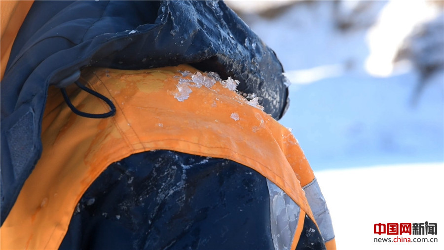 图为刨冰时溅起的冰水浸湿了衣服。