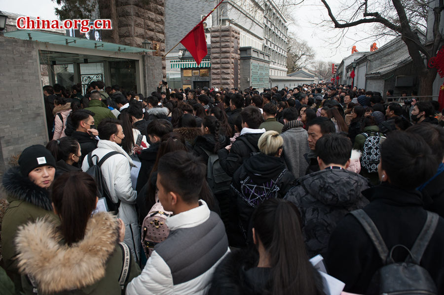 2月7日,中央戏剧学院艺考进入第二天。下午1时许,考生们排队等候入场,众多俊男靓女气质超群、颜值爆表。考生和他们的亲友以及旁观群众将本来就很局促的中戏周边道路堵得水泄不通。据其他媒体报道,今年有3.6万多人次报考该中戏,比去年增加4000多人次,为该校历年之最。陈博渊摄