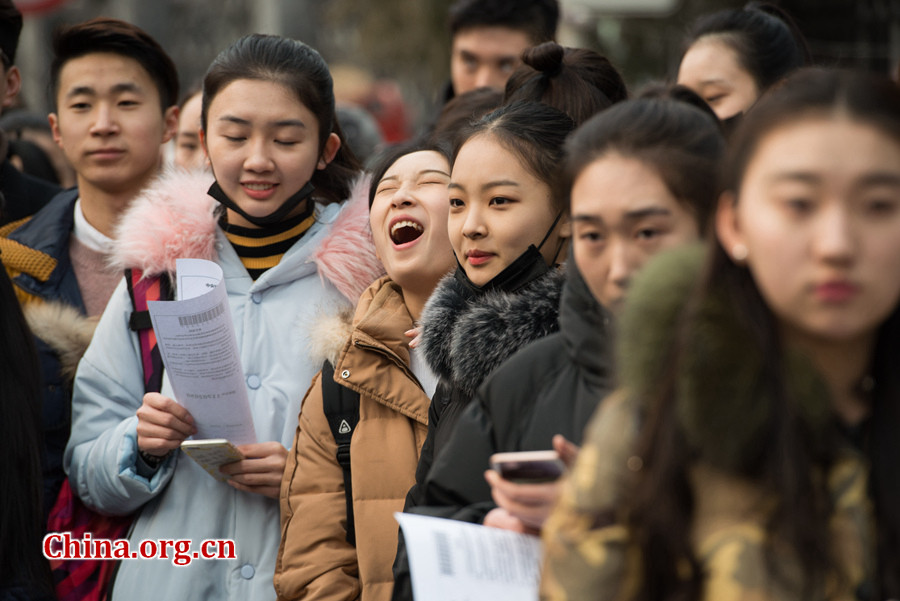 2月7日,中央戏剧学院艺考进入第二天。下午1时许,考生们排队等候入场,众多俊男靓女气质超群、颜值爆表。考生和他们的亲友以及旁观群众将本来就很局促的中戏周边道路堵得水泄不通。据其他媒体报道,今年有3.6万多人次报考该中戏,比去年增加4000多人次,为该校历年之最。陈博渊摄