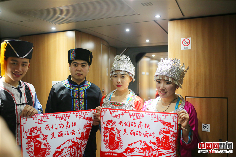2月19日,北京西站开往昆明南站的G403次列车上,乘务员穿着云南少数民族服饰为乘客表演节目。G403次是中国最长的高铁线路,北京至昆明最快只需12小时19分钟。中国网 焦源源 摄