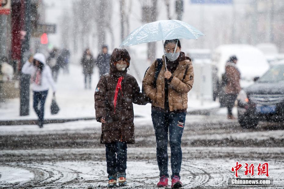 家长冒着大雪送孩子上学。 中新社记者 韦亮 摄