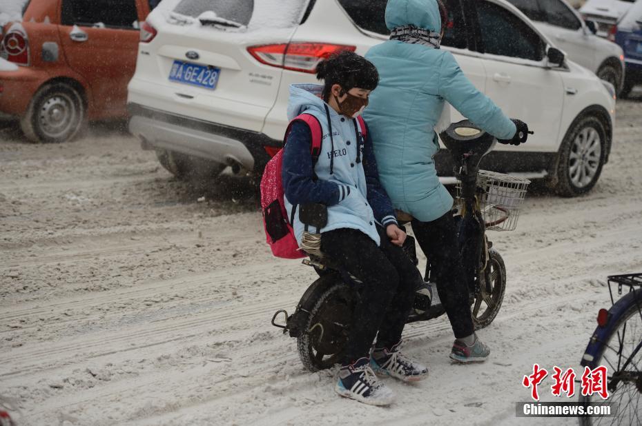 2月21日,呼和浩特降下大雪,交通受阻,市内快速路全线封闭,民众在雪中骑行。 中新社记者 刘文华 摄