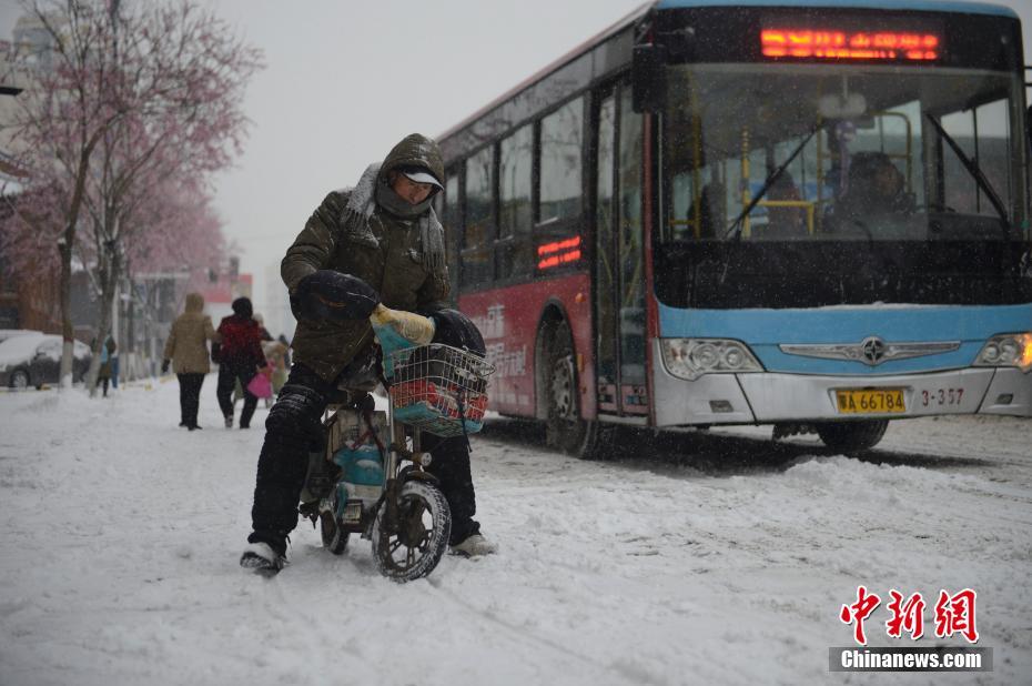 民众在雪中骑行。 中新社记者 刘文华 摄