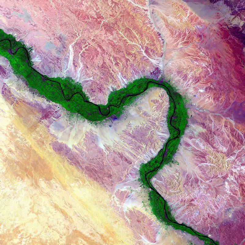 埃及尼罗河谷地与沙漠地区。尼罗河两岸定期泛滥形成的农田(绿色)与周围干旱的沙漠地带形成了鲜明的对比。
