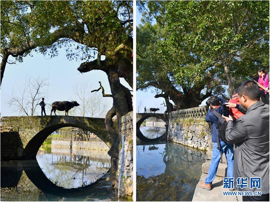 56岁的李明德在婺源严田景区表演“老翁牵牛”,平均每次表演一小时收益可达100元;右图:游客在给李明德拍照(拼版图片,3月9日摄)。