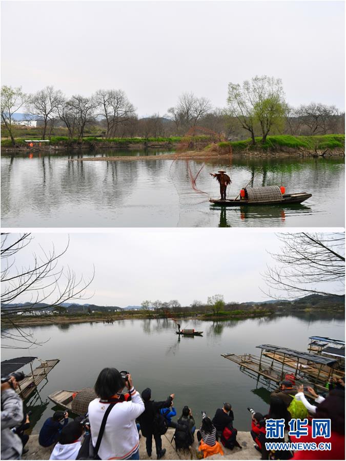 52岁的余数青在婺源月亮湾景区表演捕鱼,婺源旅游旺季时,他的表演每月收入可达1万余元;下图:游客在给余数青拍照(拼版图片,3月9日摄)。