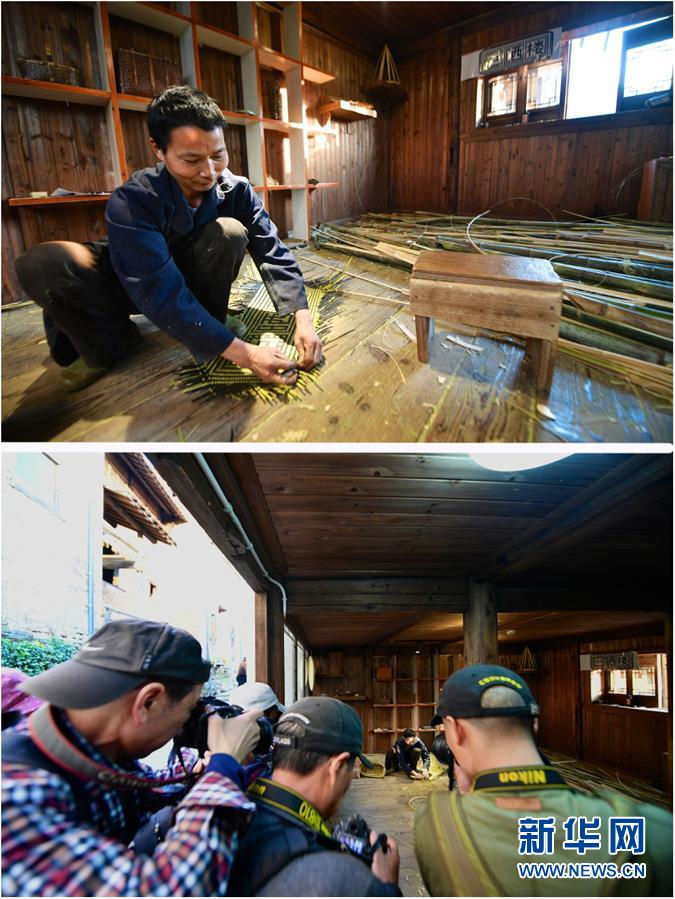 49岁的曹敬松在婺源篁岭景区表演竹编,推销他的竹编物品;下图:游客在给曹敬松拍照(拼版图片,3月8日摄)。